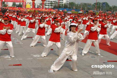 4月30日,北京奧運會迎來開幕倒計時100天。清晨,2008名天津市民匯聚銀河廣場共舞太極。 中新社發 田齊 攝