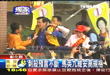 當(dāng)天上午,馬英九走出彰化縣“立委”候選人陳秀卿競選總部時,身上已經(jīng)穿了競選背心。但他最信任的貼身隨扈,卻拿著另外一件競選背心等在吉普車上。馬英九一上車,隨扈立刻幫他換上這件背心,馬英九的表情看起來不太情愿,但還是勉強(qiáng)穿上。