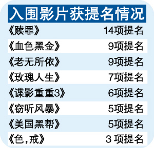 被喻為“英國奧斯卡”的2008年英國影視藝術文化學院頒獎禮(BAFTA),前日公布提名名單,《色,戒》報名角逐最佳電影、導演及女主角等11個項目,結果除了較早前公布入圍最佳新人(湯唯)和外語片之外,只有最佳服裝設計(樸若木)能獲提名;而凱拉·奈特利主演的《贖罪》,則獲得本屆最多14項提名,成為大熱之選。