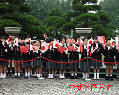 日本首相森喜朗今天在日本東京迎賓館舉行隆重的歡迎儀式,歡迎中國總理朱镕基總理訪日。圖為日本橫濱山手中華學校的華僑小學生揮舞中日兩國國旗列隊歡迎。中新社記者:王曉暉