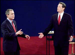 圖文:戈爾與布什最后一場電視辯論火藥味十足 2000年10月18日 13:52 ![]() 兩人在辯論中手舞足蹈,火藥味十足(據外電) 中新網香港10月18日消息:美國總統候選人戈爾及喬治布什,結束在選舉前最后一場電視辯論,為爭取游離票作最后努力。 兩人一改過往兩場辯論較禮讓的表達方式,互相狠批對方政策上的錯誤。而最新民意調查結果顯示,戈爾的表現略勝一籌。 美國有線電視新聞網絡進行的及時民調顯示,46%的受訪者認為戈爾的表現優(yōu)于喬治布什,44%的受訪者認為喬治布什的表現較佳。 今次辯論在圣路易市的華監(jiān)頓大學議事廳舉行,歷時90分鐘。而今次與前兩次不同的地方,是140名仍未決定選任何人的觀眾,直接向兩名候選人提問。而今次辯論的主要事項,除了外交外,亦會討論到醫(yī)療、教育及稅務等問題。兩名候選人都在辯論前,為在空難中喪生密蘇里州州長卡納漢默哀。 對經歷過不下一千次非正式辯論的戈爾,在辯論開始后,駕輕就熟地走到臺前,刻意與臺下觀眾拉近距離,保持一貫親民形象。鑒于在第二次辯論中,被人批評他對布什的態(tài)度過分溫和,戈爾今次主動出擊,率先狠批布什的醫(yī)療計劃。戈爾指喬治布什,未有支持一項提交國會的醫(yī)療法案建議,并指摘布什在保障病人權益上態(tài)度消極,說一套做一套。 而布什亦不甘示弱,強調自己是支持病人權利法案,并強調為了人民利益,愿意放下歧見,愿意與民主黨合作,共同把政策發(fā)展得最好。 另外,戈爾在辯論中又標榜過去8年民主黨執(zhí)政期間的經濟突出表現,并直接喬治布什支持削減富庶家庭稅項的政策,強調他只會支持削減中等家庭稅收的建議。另外,戈爾亦向觀眾自夸在外交及政治上才能,包括在參眾兩院多年的經驗,令他在軍備控制及外交具豐富經驗。 而喬治布什就公開質疑戈爾的誠信,認為他當選后,會維持現有的大政府思想,與民眾完全脫節(jié)。 辯論結束后,路透社實時訪問了6名政治分析家,其中5人均認為戈爾在辯論中較喬治布什優(yōu)勝。分析家認為,戈爾的說話,在形式以包裝均能取悅觀眾,而他的身體語言,包括盡量站在觀眾席前,均能表現親民作風。 相反地,喬治布什保持他一貫呆立的作風,經常站在臺中間發(fā)言,亦令他損失一些分數。而他不肯定的語句,及帶點“口吃”的表達方式,亦是他失分的主要原因。 不過,兩間電視臺進行的民意調查顯示,雖然兩人的支持率相當接近,但喬治布什輕微領先戈爾2至6個百分點。另外,民意調查亦顯示,仍然有7 %選民未決定取向,而有17%人表示,在選舉當日仍有機會改變主意。(據TVB) 相關報道:圖文:戈爾及布什第三輪電視辯論開始 相關報道:戈爾和小布什今天進行最后一場電視辯論 相關報道:三項最新民調均顯示,布什繼續(xù)領先戈爾 相關報道:調查顯示小布什第二輪電視辯論表現佳 相關報道:美國選民認為喬治布什比戈爾誠實 |