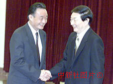 中國國務(wù)院總理朱镕基訪問日本、韓國后,22日乘專機(jī)回到北京,國務(wù)院副總理吳邦國等在北京人民大會堂迎接。中新社記者 毛建軍 攝