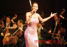‘臺灣歌星李玟二十一日晚在澳門國際音樂節閉幕式上連唱數曲,這是她首次在龐大的古典樂隊伴奏下演唱,臺風時而莊重,時而活潑。中新社傳真 宗金柱 攝