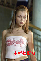 一名到北京參加大都會(huì)世界超級(jí)模特大賽的俄羅斯少女,日前晚會(huì)上身著龍紋胸圍向新聞界亮相。中新社記者 賈國(guó)榮 攝