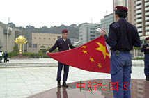 圖文:澳門警察在蓮花廣場彩排時疊好國旗