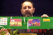 澳門郵政局將于二十日發行一套紀念澳門回歸一周年的郵票,圖為該局局長羅庇士向媒體展示郵票樣本。中新社傳真宗金柱攝