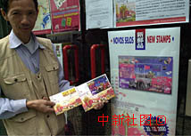 澳門郵政局20日發(fā)行澳門特區(qū)成立一周年紀(jì)念郵票,專門從香港乘早班船到澳門訂購郵票的朱炳然先生高興的展示排隊選購到的紀(jì)念郵票。中新社傳真洪少葵攝