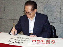 江澤民20日參觀澳門博物館后欣然簽名留念。中新社傳真 董會峰 攝