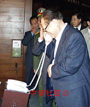國家主席江澤民在參觀澳門博物館時通過為游客特設的電話聽取該館的錄音介紹。中新社傳真 董會峰 攝