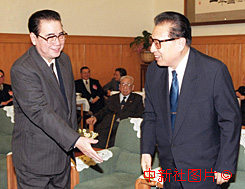 李鵬與喬石十一日出席全國政協九屆三次會議閉幕大會時在休息廳交談。作者:宗金柱
