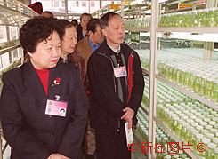 參加全國政協(xié)九屆三次會議的部分政協(xié)委員十一日上午參觀北京錦繡大地農(nóng)業(yè)觀光園區(qū)內(nèi)的植物基因?qū)嶒炇遗嘀驳男缕贩N。作者:羅仰明