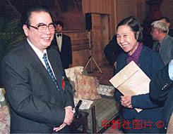 中共中央政治局常委、全國人大委員長李鵬,五日到九屆全國人大三次會議北京代表團參加小組討論時,與著名兒科專家胡亞美交談。作者:李剛