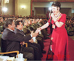 下榻于京西賓館的全國人大西藏、新疆和解放軍的代表五日晚舉行聯(lián)歡會。著名歌唱家耿蓮鳳(解放軍代表)為代表們演唱歌曲。作者:王麗南
