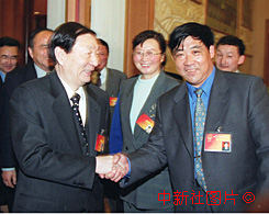 朱镕基總理八日參加全國人大寧夏代表團討論會時,與來自煤礦工人的徐貴(右)代表親切交談。作者:彭偉翔
