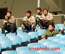 正在為北京申辦2008年奧運(yùn)會(huì)而進(jìn)行體育場(chǎng)館改造的工人們,為了爭(zhēng)取時(shí)間,頂著冬天的寒風(fēng)在工地上午餐。中新社記者 李剛 攝