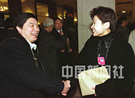 全國政協委員,著名歌唱家董文華和著名運動員王義夫在政協開幕式上喜相逢。中新社記者 錢興強 攝
