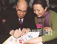 全國政協(xié)委員、著名京劇表演藝術(shù)家袁世海,在北京參會中為青年委員李羚題寫折扇。中新社記者 錢興強 攝