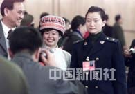 九屆全國人大四次會議第五次全體會議十五日上午在北京人民大會堂舉行,出席會議的少數民族代表與著名歌唱演員宋祖英合影。中新社記者 毛建軍 攝