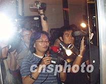 美國駐華使館原定四月三日晚十時在海口文華大酒店舉行記者招待會,延至四日凌晨一時四十分宣布取消。圖為美國駐華大使館武官及使領館人員在文華大酒店電梯口出現時,被現場中外記者追訪。中新社記者 莫成雄 攝