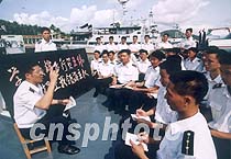 中國海軍駐海南的艦艇部隊官兵日前聽取部隊領導介紹四月一日撞機事件的情況。中新社圖 龍運河 攝