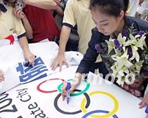 廣州中山大學、暨南大學等十所高校十八日在中山大學聯合舉行“華南萬名師生支持北京申奧巡回簽名活動首簽式,中國奧運冠軍劉璇在場簽名。中新社記者 羅仰明 攝