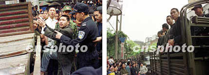 新聞組圖:中國各地嚴打行動 2001年4月25日 10:04 ![]() 圖(1) 圖(2) ![]() 圖(3) 圖(4) ![]() 圖(5) 圖(6) 圖(1)說明:北京西城公安分局、工商局日前聯合在夜間清理音像市場,當場抓獲販賣盜版光盤人員十余名。中新社記者宋吉河攝 圖(2)說明:北京公安西城公安分局日前夜間收容外地進京“三無”人員,全面整頓社會治安。中新社記者宋吉河攝 圖(3)說明:重慶市巴南區二十四日在電影院廣場前公開審判十九名刑事犯罪分子,上千名當地群眾參加了大會,無不拍手稱快。中新社記者趙振清攝 圖(4)說明:福清市公安邊防大隊官兵,23日凌晨在“治爆緝槍專項行動”中,先后破獲二起特大偷運、私藏炸藥案,共查獲土制銨油炸藥5000多公斤、雷管283枚、導火索250米。圖為一名邊防警員在福清海口鎮方新村官下尾路段攔檢一輛裝載有土制銨油炸藥的可疑貨車。中新社圖賀錕陳暉攝 圖(5)說明:中國重慶市巴南區二十四日在該區電影院廣場前公開審判十九名刑事犯罪分子,當地上千名市民圍觀犯罪分子被押上刑車,送往監獄的過程。中新社記者趙振清攝 圖(6)說明:中國重慶市巴南區二十四日在該區影院廣場公開審判十九名刑事犯罪分子,當地千名市民現場目睹犯罪分子被押上刑車,送往監獄的過程。中新社記者趙振清攝 |