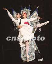 倍受關注的芭蕾舞劇《大紅燈籠高高掛》二十六日晚在北京天橋劇場首次彩排。圖為國家一級演員朱研主演的“三姨太”與武生趙云(扮演者孫杰)相愛一幕。中新社圖 史利 攝