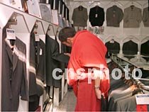 一位西藏喇嘛今夏在拉薩一家服裝店選購西服。一些寺廟的喇嘛利用自已會多種語言、了解名勝古跡的條件,有時需要脫掉袈裟為游客當導游。中新社記者 宋吉河 攝