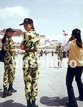 在西藏拉薩,追逐新潮的藏族女孩子,身穿迷彩服,到布達(dá)拉宮廣場留影。中新社圖 吳新華 攝