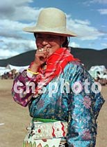 一位藏北牧區(qū)的藏族女青年八月中旬到當(dāng)雄縣參加物資交流會時,身穿華麗的藏袍,佩玉戴銀,面對客人保持純樸的笑容。中新社圖 趙偉 攝