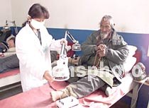 西藏拉薩市藏醫院將傳統藏藥與中醫針灸療法結合,治療藏民常見病風濕性關節炎,成效顯著。該院的門診醫生十七日正用電針灸為一位患嚴重風濕關節炎的藏民治療。中新社圖 趙偉 攝
