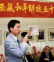 曾與海外藏獨分子有過正面交鋒的羅德島大學研究生莊輝廷,拿著一份刊有藏獨讕言的英文報紙,譴責藏獨分子捏造事實,欺騙世界輿論的卑鄙行徑。他建議中國政府加強對外介紹西藏,讓世界知道西藏的真面目。中新社圖 龔文謨 攝