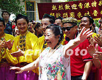 五月末在新疆吐魯番考察的香港代表團被新疆民族歌舞吸引,華懋集團主席龔如心裝扮獨具一格跳起舞來。中新社圖 陳國華 攝