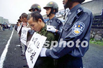 中國安徽省繁昌縣公檢法部門三十日召開“公捕公判”大會。十一名犯罪分子在 六十余名荷槍實彈的警察和武警戰士押解下進入體育場并被公開宣判。中新社圖 吳芳 攝