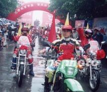 重慶三千萬兒女支持北京申奧宗申鐵騎大西征在重慶市賀龍雕像前啟程。由20余人組成的鐵騎隊要跨越中國西部的云南、貴州、四川、青海、西藏等7省區(qū),經(jīng)歷12000千公里艱難旅程的考驗,表達(dá)重慶人民支持北京申辦2008年奧運(yùn)會的決心。中新社圖 雷鳴 攝