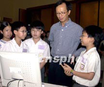 香港財政司司長梁錦松周六上午一身便裝出席香港優(yōu)秀電腦網(wǎng)頁設(shè)計比賽頒獎典禮時,欣賞由十二歲少年蔡悅剛(右一)設(shè)計的網(wǎng)頁。中新社傳真任晨鳴攝