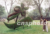天津人民公園內六月設立“迎奧運”的草雕景點,用八萬多棵青草組成,表達了天津人民支持北京申奧的熱切心情。中新社圖 姬培棟 攝
