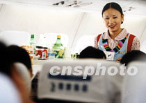藏族空姐卓嘎日前在飛越青藏高原的“空中客車”上,為北京——拉薩航線的乘客提供細致周到的服務,讓乘客盡早地感受到西藏氣息。飛行青藏高原的西南航空公司目前已經錄用了十五名藏族空姐。中新社記者 滿會喬 攝
