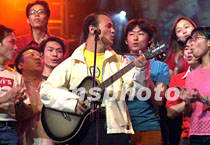 “同一首歌──走進澳門”演唱會十二日晚在澳門文化中心舉行,來自中國內地、香港、臺灣、澳門的眾多新老歌星同臺演出。圖為臺灣歌星張行在演唱會上與當地青年同臺演唱。中新社傳真 宗金柱 攝