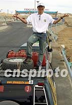 6月14日,“申奧萬里行”鳳凰車隊出關進疆,踏上了西進的新征途。圖為主持人梁永斌站在車頂上主持車隊進疆“儀式”。中新社圖 魏孝明 攝