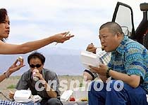 由于“考慮”太過周到,今早從敦煌出發前,車隊備足了方便午餐,準備“對付”各種情況。但出乎大家意外的是,312國道新疆路段已修成一級公路,本需七八個小時的行程“節省”了二個多小時。中午十二點,距離哈密市區不到十公里,我們只好在大漠上“安營札寨”,吃上了一個月來的第一次“野餐”。將隨隊遠征邊疆的歌星臧天朔嚼著烙餅,樂哈哈地與隊友們開起了玩笑。
