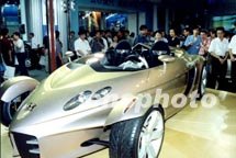 2001第九屆上海國際汽車工業展覽會18日開幕。圖為車展上一款外形獨特的跑車吸引了眾多觀展的上海市民。中新社圖 姜煜 攝