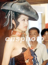 日前, 在北京舉辦一臺以漁家服飾為主題的現(xiàn)代創(chuàng)意時裝秀,參賽的服飾作品在款式上均于漁家生活貼近,并具有創(chuàng)新意識。圖為穿現(xiàn)代時裝,配戴一頂“魚型帽”的新穎作品。中新社記者 錢興強 攝