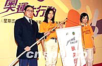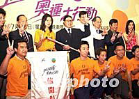 特備節目「邁向2008奧運大行動」5日舉行記者會。香港體育協會暨奧林匹克委員會會長霍震霆聯同體協會副會長許晉奎、馮劉掌珠、秘書長彭沖等與運動員許長國、胡兆康及眾藝員出席頒受「旗開得勝」旗幟儀式。中新社圖 鄧慶樂 攝
