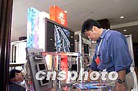 北京申奧代表團9日與其他申辦城市在莫斯科世貿中心酒店布置展臺。圖為北京申奧代表團在緊張布展。中新社記者 王瑤 攝