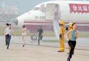 中新網臺北7月11日消息:臺北松山機場昨日舉行炸彈及毒氣爆炸應變演習,包括消防人員﹑軍人﹑特種部隊及警員在內約三百多人參加。圖為機組人員模擬發生毒氣外泄事故,緊急放下充氣逃生滑梯,從機艙中跑到停機坪上疏散的情景。