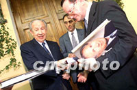 2001年7月11日晚上,在莫斯科“普希金文學藝術館”、莫斯科奧委會向國際奧委會主席薩馬蘭奇贈送《從莫斯科到莫斯科》畫冊,這本畫冊講述了薩馬蘭奇真實故事。中新社記者 王瑤 攝