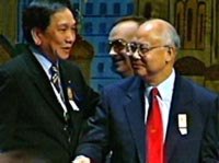 13日晚,北京申奧成功后,國際奧委會(huì)委員們向奧委會(huì)執(zhí)委何振梁表示祝賀。