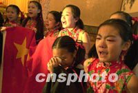 在莫斯科成功聲援北京申辦奧運會的中央樂團少女合唱團小歌手們,圍著五星紅旗眼含淚花而歌唱。八年前,這個合唱團也曾遠征奧委會為北京申辦獻歌,失利后含淚返京。今日終于高唱凱歌。中新社記者 賈國榮 攝