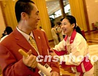 中國著名導演張藝謀與奧運會冠軍劉璇,在中國駐莫斯科大使館互相祝賀北京申辦奧運會成功。中新社記者 賈國榮 攝